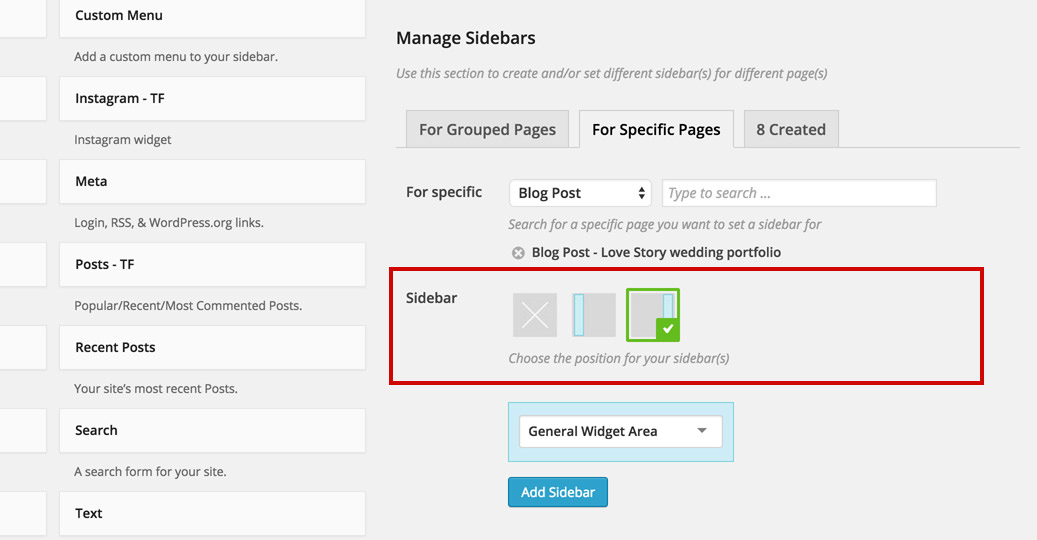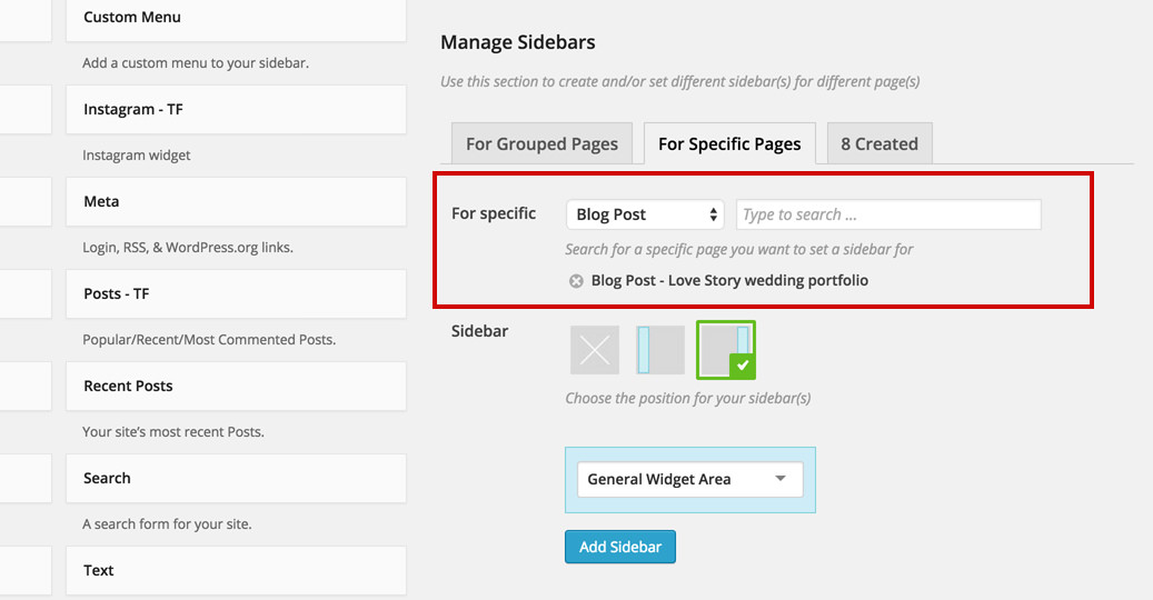 Lets add a new sidebar to a specific blog post. In order to do that, select the For Specific Pages tab.