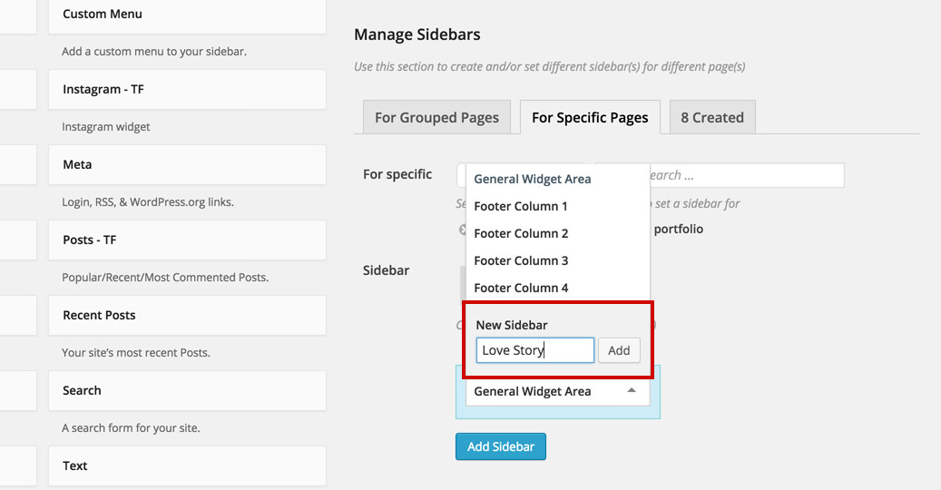Press the Add Sidebar button in order to create your new sidebar.