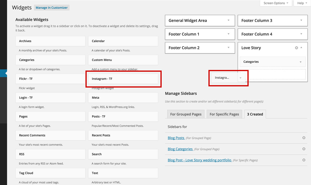 They can be easily added, rearranged and removed by dragging it to the chosen place in Appearance›Widgets.
