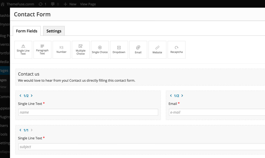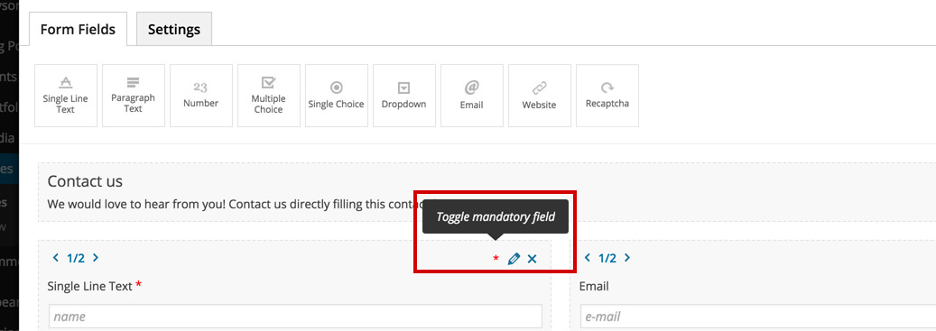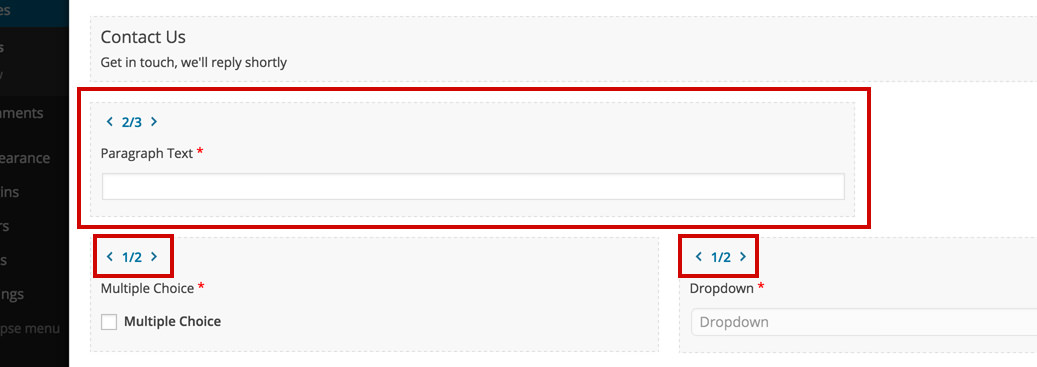 Every contact form field comes in its own default 2/3 column that can be changed using the arrows.