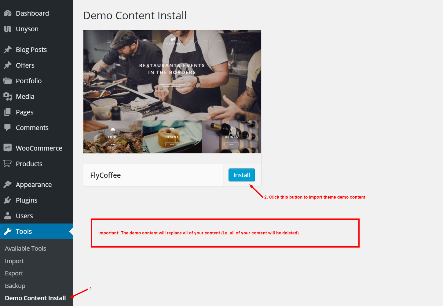 After installing Unyson plugin and all Theme Compatible extensions in Tools appear "Demo Content Install"